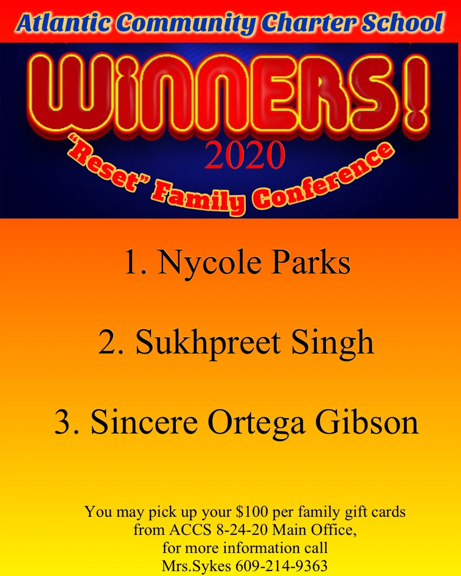 Family Conference Winners! Aug 26 Written By Steve DiMatteo Congratulations to the winners of our Reset, Restart, and Recovery conference giveaways! These parents attended all three virtual sessions. Thank you for your support and enjoy the giftcards! Steve DiMatteo